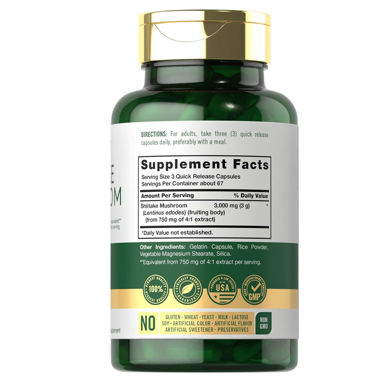 دارای 3000 میلی گرم قارچ شیتاکه در یک وعده مصرف و 1000 میلی گرم در یک کپسول
